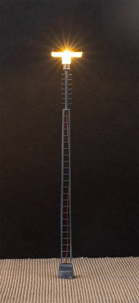 Modell einer weitverbreiteten Aufsatzleuchte mit Flachgittermast aus Metall. Besonders geeignet zur Beleuchtung von bahnnahen Szenerien, wie Bahnhöfen, Betriebswerken oder Gleisfeldern. Die zweiflammige Leuchte ist mit langlebiger LED-Technik ausgestattet. Höhe: 145 mm.