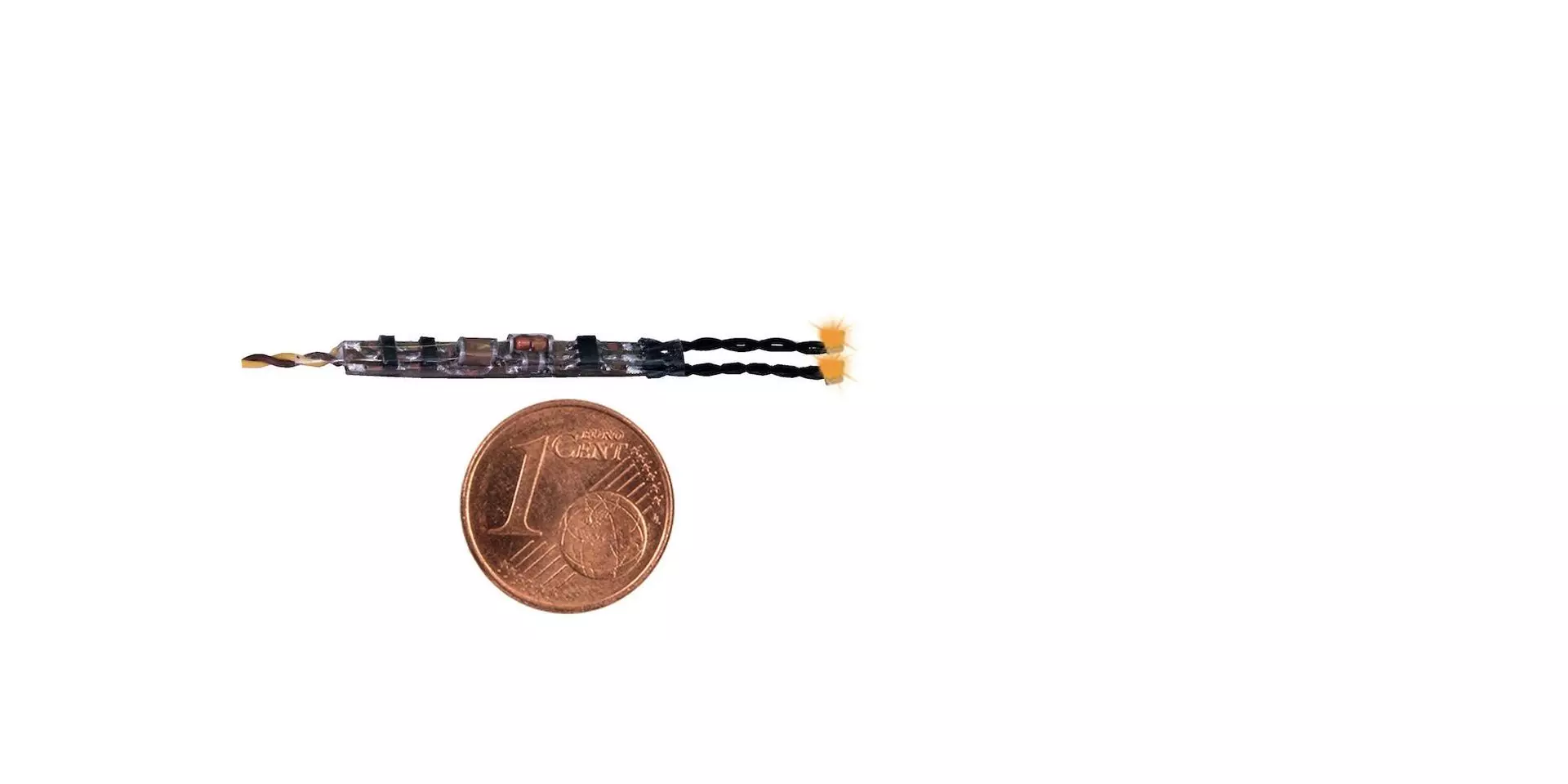 Besonders kompakte Blinkelektronik, die sich wegen der kleinen Abmessungen direkt in Fahrzeuge einbauen lässt. Beide LEDs blinken unabhängig voneinander. Der Betrieb ist auch mit einer LED alleine möglich. Zur einfachen Verdrahtung sind bereits Drähte an den LEDs angelötet.Maße Elektronik: L 25 x B 4 x H 3 mm, LED: L 1,6 mm x B 0,8 mm.