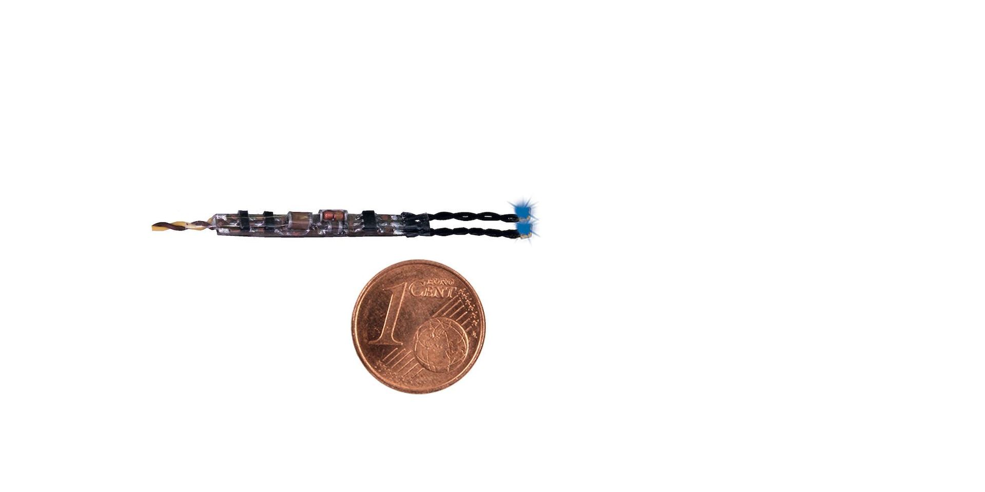 Besonders kompakte Blinkelektronik, die sich wegen der kleinen Abmessungen direkt in Fahrzeuge einbauen lässt. Beide LEDs blinken unabhängig voneinander. Der Betrieb ist auch mit einer LED alleine möglich. Zur einfachen Verdrahtung sind bereits Drähte an den LEDs angelötet.Maße Elektronik: L 25 x B 4 x H 3 mm, LED: L 1,6 mm x B 0,8 mm.
