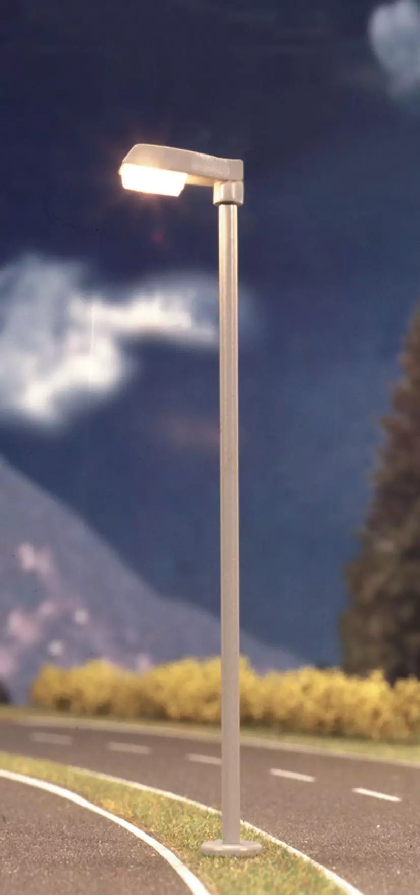 Moderne Straßenleuchte der Epochen IV – VI. Vorbildgetreuer Messingmast mit Patentsteckfuß für eine besonders einfache Montage. Wartungsfrei dank LED-Beleuchtung. Höhe: 100 mm. TIPP: Das Powermodul Art. 5215 sorgt für flackerfreies Licht beim Betrieb mit Wechselstrom und erzeugt nahezu doppelte Helligkeit.