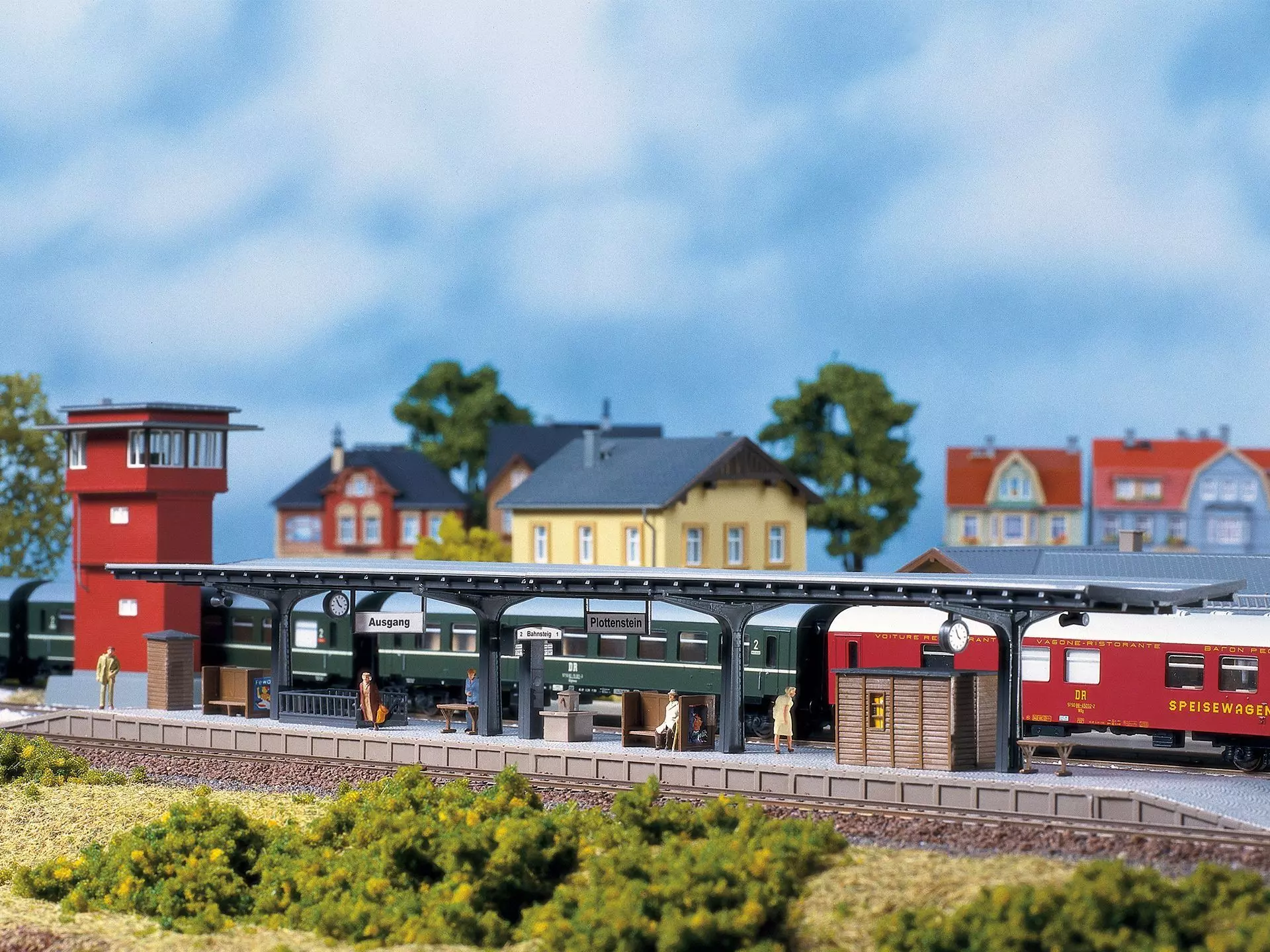 Mit Teerpappdach und Stahlträgerkonstruktion sowie Unterführung. Wahlweise kann die Unterführung auch weggelassen werden. Gepäckablagetische, Bänke mit Werbeflächen, Papierkörbe, Bahnsteig- und Fahrtrichtungsanzeige, Lautsprecher, Uhren und Hinweisschilder liegen bei. Ein Fernsprechhäuschen und ein Warteraum, ein Brunnen und Gleisübergänge für 2 Gleise ergänzen die reichhaltige Ausstattung. Zur besseren Darstellung der Bahnsteigunterführung liegt dem Bausatz eine Treppenverlängerung bei.