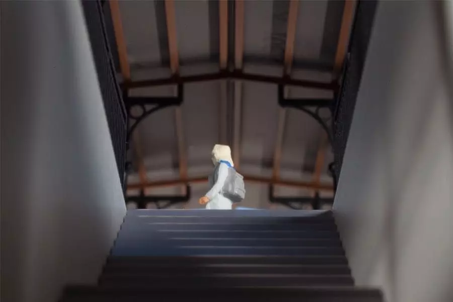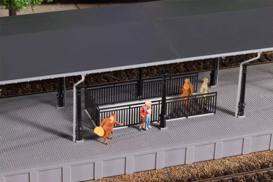 Bahnsteig mit gusseisernen Säulen. Die Treppe zur Unterführung muss nicht zwingend eingebaut werden. Das Geländer ist aus stabilem Karton in Lasercut-Technologie gefertigt. Bitte beachten Sie dazu unseren Basteltipp im Katalog oder unter www.auhagen.de.