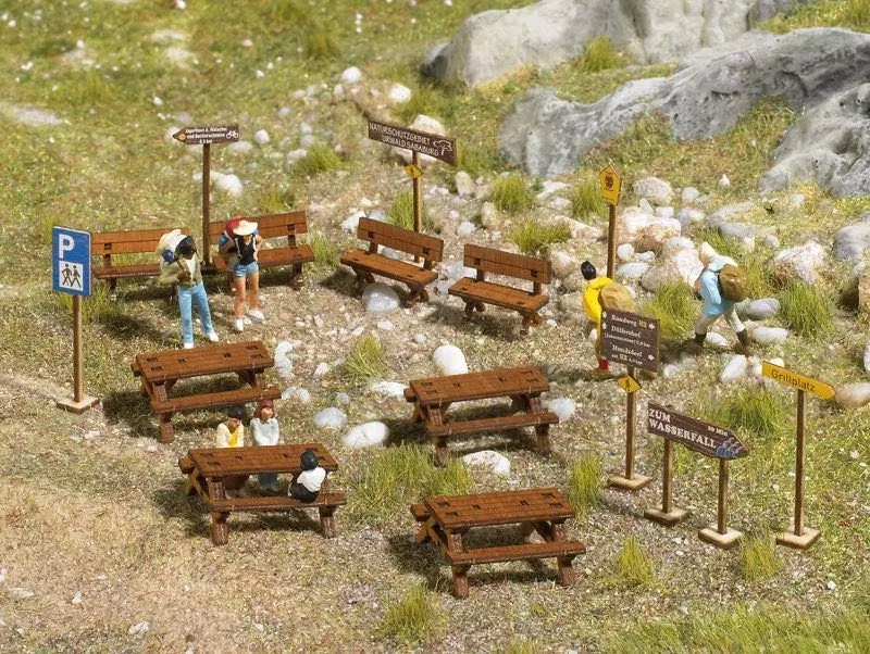 Bausatz für typische Sitzgarnituren aus echtem Holz, die ebenso wie die beiliegenden Schilder im präzisen Laser-Cut Verfahren geschnitten wurden und bereits in Originalfarbe koloriert sind. Das Set besteht aus vier Sitzbänken, vier Sitzgarnituren mit Tischen und auf Echtholz bedruckte typische Schilder und Wegweiser mit Pfosten und Standfüßen.