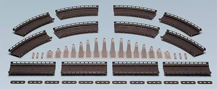 mit 4 geraden und 8 gebogenen Gleisbetten. Zwei 8-teilige Pfeilersätze von 15 bis 75 mm und 6 Pfeiler-Verlängerungsteile mit je 8 mm.