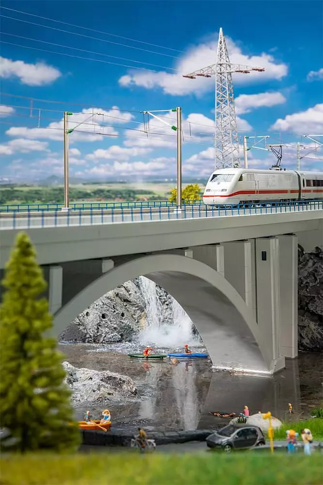 Faszination Brückenbau! Moderne, weitgespannte Betonbogenbrücke mit jeweils zwei anschließenden Brückenfeldern und Widerlagern in Anlehnung an die Thüringer Rehtalbrücke. 2-gleisig befahrbar und für alle Modellgleise verwendbar.