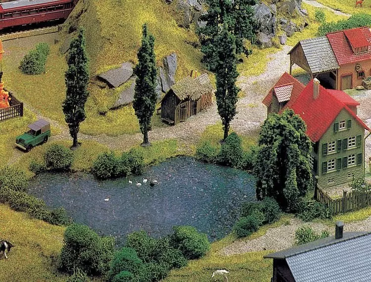 Gestalten Sie den Uferbereich in Abhängigkeit von der Umgebung, welche Sie auf Ihrem Diorama oder Ihrer Modellanlage darstellen wollen. Am besten verwenden Sie hierzu den braun vorgefärbten Landschaftsleim Colofix-Color (Art. 170660). Streuen Sie dann die gewünschten Materialien, z.B. FALLER PREMIUM Streumaterial (Art. 171692) in den noch nassen Leim. Sie können auch Abschnitte aus unseren Landschafts-Segmenten (z.B. Art. 180474) herauslösen und auf der Böschung verteilen. Das schönste Ergebnis erhalten Sie, wenn Sie zuletzt verschiedene Grasfasern mit Hilfe des Begrasungsgerätes Gras-Fix (Art. 180691) in den noch nassen Leim einbringen.