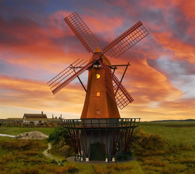 Bausatz. Der Turm ist mit Holzschindeln verkleidet. Beherrschend wirkt die umlaufende hölzerne Galerie mit den langen Stützbalken. Mittels eines Sterts werden die Flügel in den Wind gedreht. Maße: L 16,5 x B 10,5 x H 23 cm. Schwierigkeitsgrad: 2 (Fortgeschrittene).