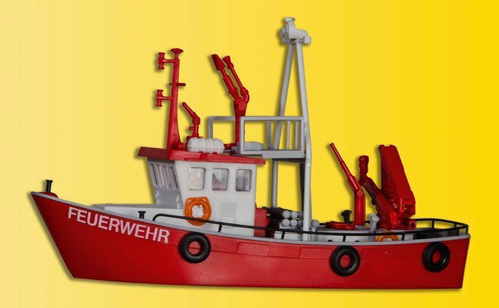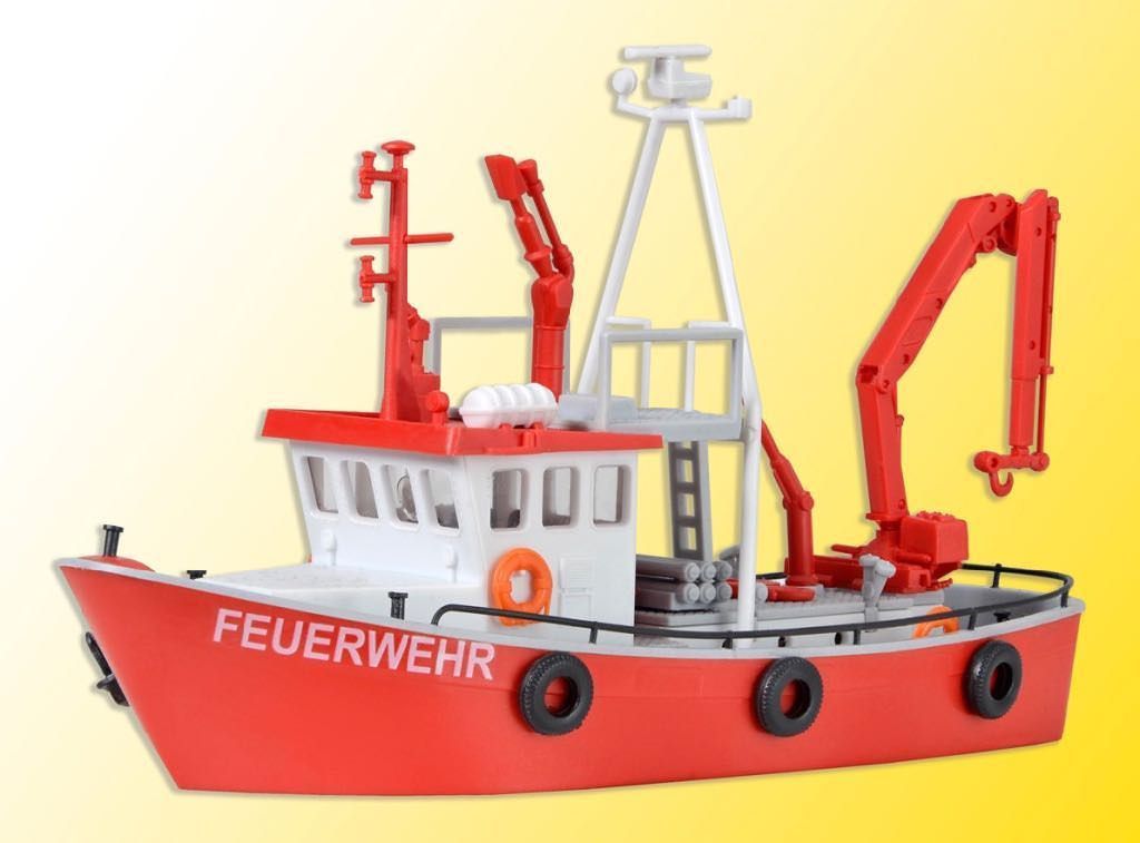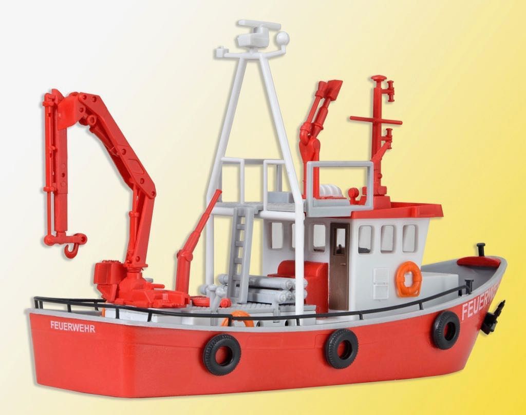 Bausatz. Dieses Feuerwehrschiff hat zwar kein konkretes Vorbild, doch finden sich vielerorts ähnliche Feuerlösch- und Hilfeleistungsboote sowohl in den Seehäfen als auch auf Binnengewäsern. Das ca. 37 BRT große Boot verfügt über einen kombinierten Schaum-/Wasserwerfer sowie 2 Wasserwerfer. Zum Lenzen und Umpumpen stehen C-Abgänge und Saugschläuche zur Verfügung. Der hydraulische Kran dient nicht nur zum Bergen, sondern kann auch Gerät oder Schlauchbrücken auf die zum Teil sehr hohen Decks großer Seeschiffe hieven. Nicht nur Berufs-, sondern auch die Werksfeuerwehren z. B. großer Chemiewerke, setzen solche kleinen und wendigen Boote ein. Maße: L 14 x B 5,5 x H 8,5 cm. Schwierigkeitsgrad: 2 (Fortgeschrittene).
