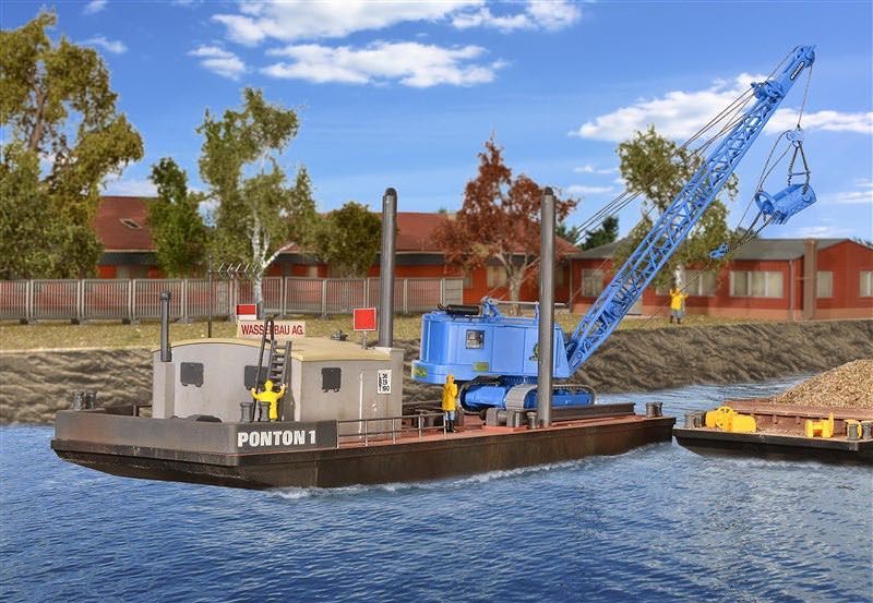 Bausatz. Maße: Arbeitsponton L 28 x B 9 x H 10,8 cm, Bagger L 7 x B 4 x H 16,5 cm. Schwierigkeitsgrad: 2 (Fortgeschrittene).