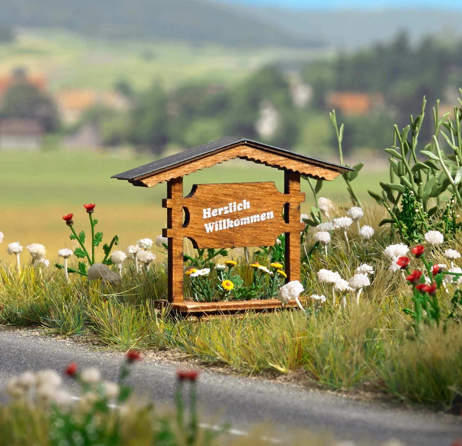 Ländliches Ortseingangsschild aus Holz mit Überdachung und Blumenkasten. Beidseitige Bedruckung des Schildes zur Begrüßung »Herzlich Willkommen« und Verabschiedung »Auf Wiedersehen. Gute Fahrt«. Mit Sommerblumen bepflanzt. Inkl. Parkbank, Abfallkorb, Findling und kleinem Busch für die Ausgestaltung. Fertigmodell.