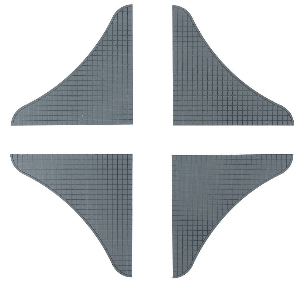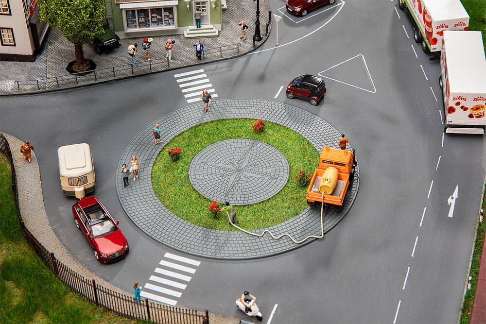 Straßen- und Wegebau-Set mit Spritzguss-Kleinteilen für die Gestaltung eines großen Kreisverkehrs mit Verkehrsinsel oder eines mittelgroßen Kreisverkehrs, Gehsteigen und einer Verkehrsinsel. Beidseitige Gravur für den Bau mit Rauten- oder Quadermuster. Passend z. B. zum »Gehwegplatten-Set«, Art. 180537.