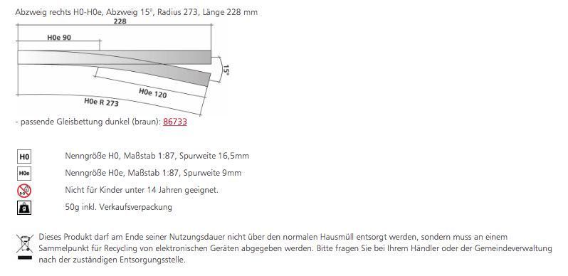 Eigenschaften "Tillig 85181 - Abzweig rechts Länge 228 mm H0-H0e "