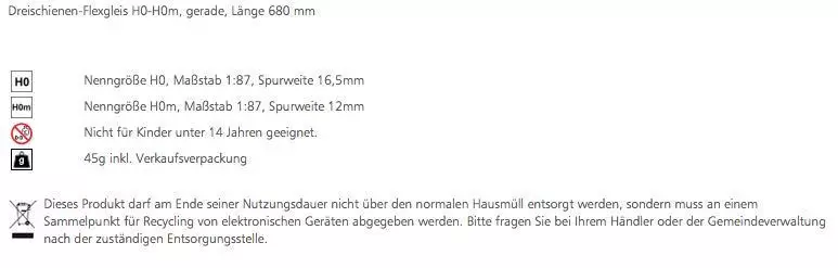 Eigenschaften "Tillig 85127 - Dreischienen-Flexgleis H0-H0m gerade Länge 680 mm"