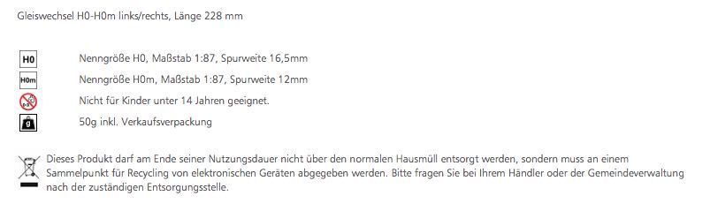 Eigenschaften "Tillig 85187 - Gleiswechsel H0-H0m links/rechts Länge 228 mm"