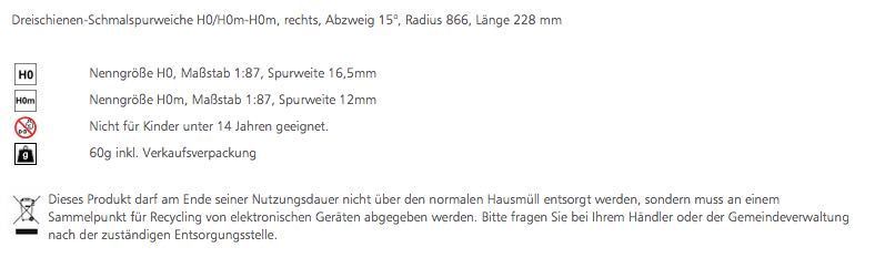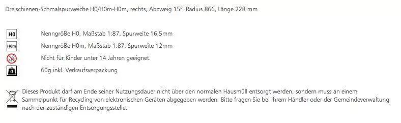 Eigenschaften "Tillig 85193 - Dreischienen-Schmalspurweiche H0/H0m-H0m rechts Länge 228 mm"