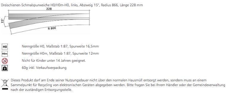 Dreischienen-Schmalspurweiche H0/H0m-H0, links, Abzweig 15°, Radius 866, Länge 228 mm