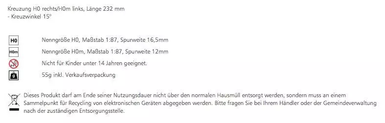 Eigenschaften "Tillig 85262 - Kreuzung H0 rechts/H0m links Länge 232 mm Kreuzwinkel 15°"