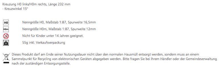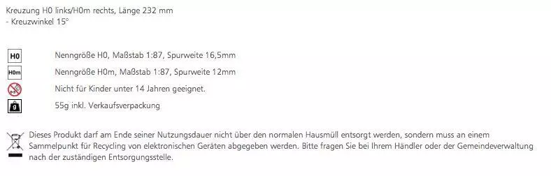 Eigenschaften "Tillig 85263 - Kreuzung H0 links/H0m rechts Länge 232 mm Kreuzwinkel 15°"