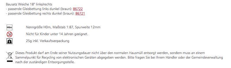 Eigenschaften "Tillig 85640 - Bausatz Weiche 18° links/rechts H0m"