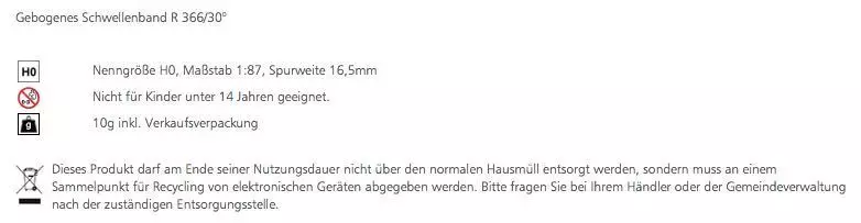 Eigenschaften "Tillig 85040 - Gebogenes Schwellenband R 366/30° H0/GL"