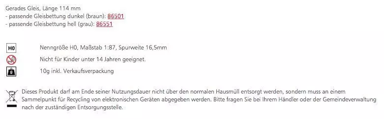Eigenschaften "Tillig 85124 - Gerades Gleis Länge 114 mm H0/GL"