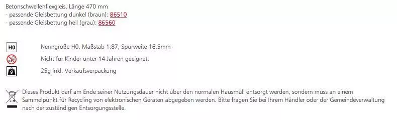 Eigenschaften "Tillig 85134 - Betonschwellenflexgleis Länge 470 mm H0/GL"