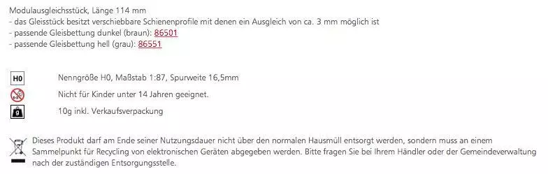 Eigenschaften "Tillig 85139 - Modulausgleichsstück Länge 114 mm H0/GL"