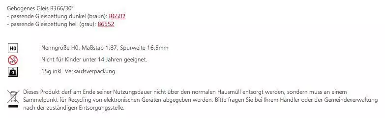Eigenschaften "Tillig 85140 - Gebogenes Gleis R366/30° H0/GL"