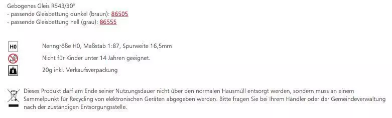 Eigenschaften "Tillig 85145 - Gebogenes Gleis R543/30° H0/GL"