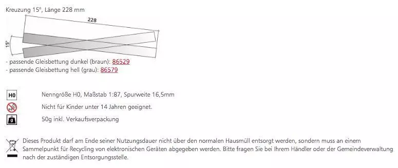 Eigenschaften "Tillig 85160 - Kreuzung 15° Länge 228 mm H0/GL"