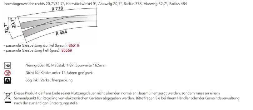 Eigenschaften "Tillig 85313 - Innenbogenweiche rechts 207°/327° Herzstückwinkel 9° H0/GL"