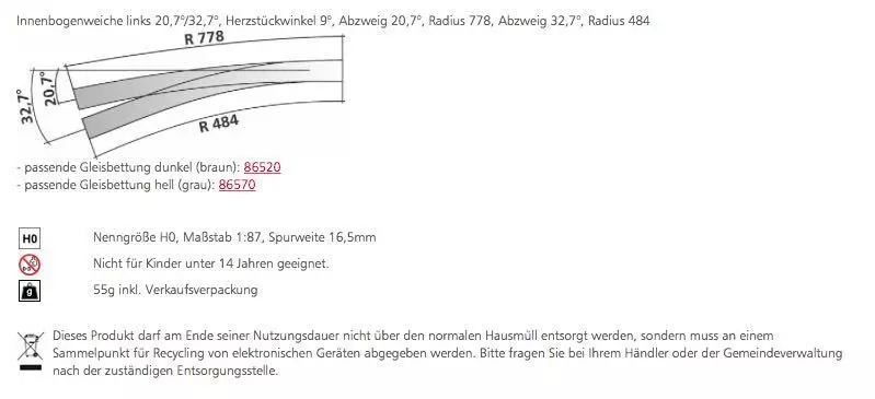 Eigenschaften "Tillig 85314 - Innenbogenweiche links 207°/327° Herzstückwinkel 9° H0/GL"
