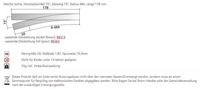 Weiche rechts, Herzstückwinkel 15°, Abzweig 15°, Radius 484, Länge 178 mm