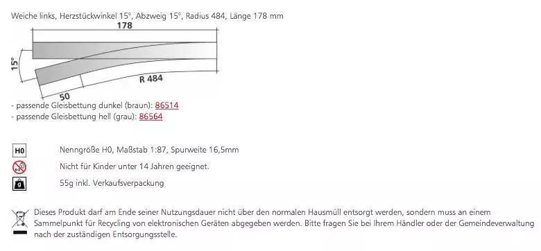 Herzstückwinkel 15°, passender Antrieb - 86112 Weiche links, Herzstückwinkel 15°, Abzweig 15°, Radius 484, Länge 178 mm