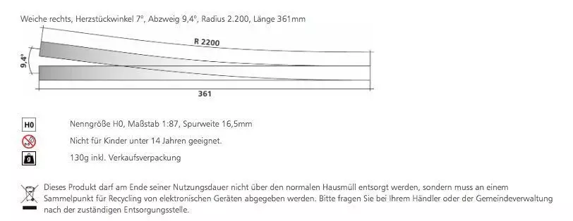 Weiche rechts, Herzstückwinkel 7°, Abzweig 9,4°, Radius 2.200, Länge 361mm