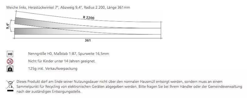 Weiche links, Herzstückwinkel 7°, Abzweig 9,4°, Radius 2.200, Länge 361mm
