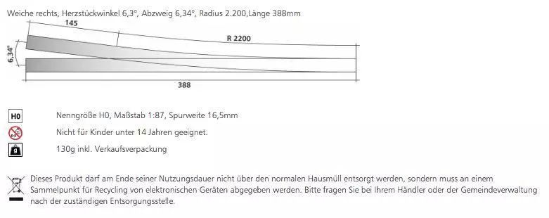 Weiche rechts, Herzstückwinkel 6,3°, Abzweig 6,34°, Radius 2.200,Länge 388mm