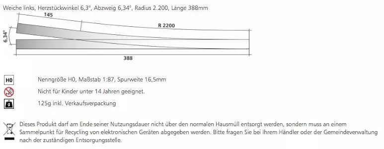 Weiche links, Herzstückwinkel 6,3°, Abzweig 6,34°, Radius 2.200, Länge 388mm