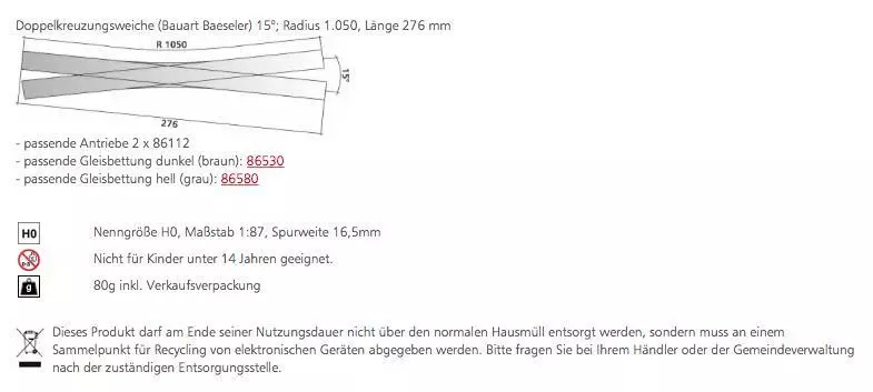 Eigenschaften "Tillig 85391 - Doppelkreuzungsweiche (Bauart Baeseler) 15° H0/GL"