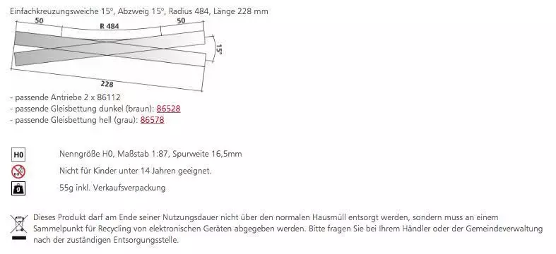 Eigenschaften "Tillig 85395 - Einfachkreuzungsweiche 15° Länge 228 mm H0/GL"