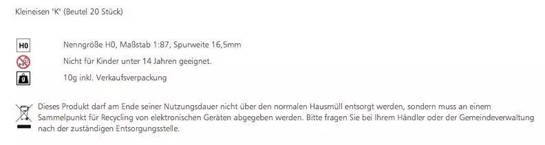 Eigenschaften "Tillig 85530 - Kleineisen K (Beutel 20 Stück) H0/GL"