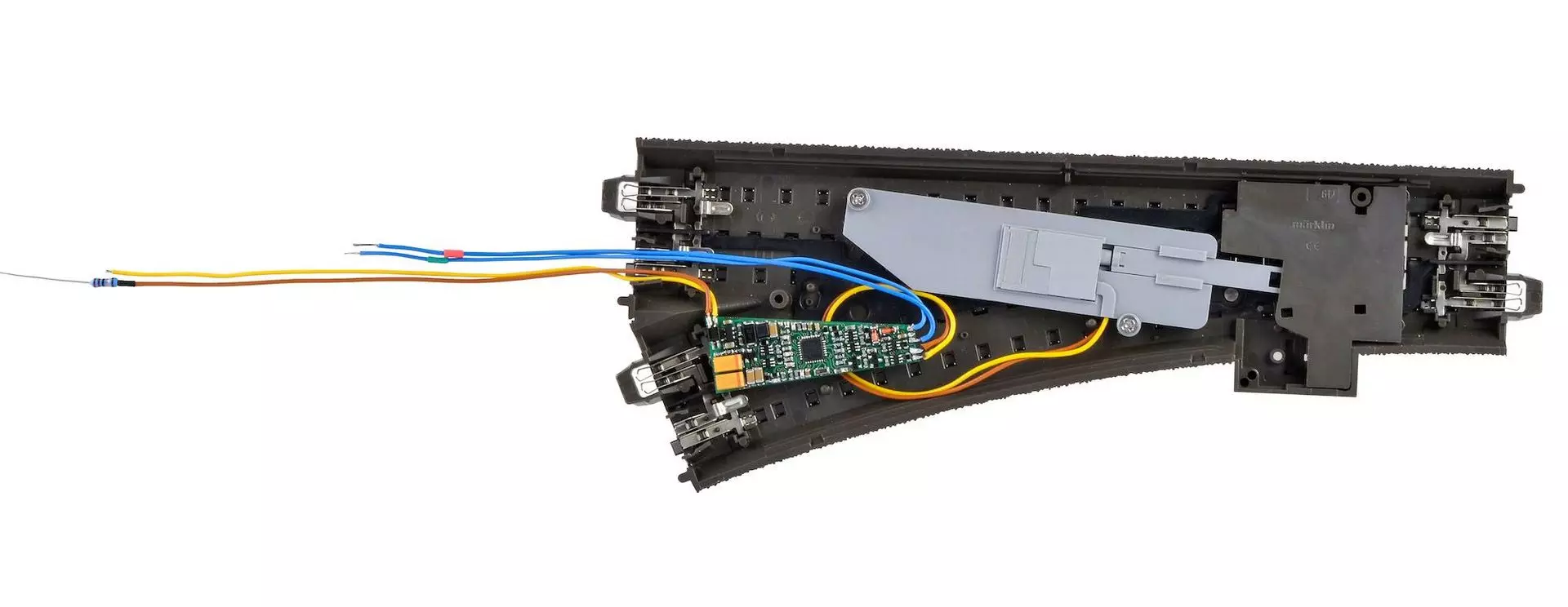 Dieser spezielle Weichenantrieb ist ein kraftvoller, geräuscharmer Antrieb mit zugehörigem Digitaldecoder zum Einbau in Märklin und Trix C-Gleissystemweichen. Der Decoder befindet sich als Baugruppe im Kabel, daher ist der Antrieb besonders kompakt. Der Weichenantrieb zeichnet sich durch vorbildgerecht langsame Bewegung der Weichenzungen aus. Geschwindigkeit und Bewegungsablauf sind elektronisch gesteuert und gewährleisten einen feinfühligen Antrieb. Wenn aufgrund der Eigenschaften Ihrer Weiche die Bewegungsrichtung nicht mit der Schaltrichtung auf Ihrem Eingabegerät übereinstimmt, können Sie im Digitalbetrieb die Stellrichtung des Antriebs invertieren. Der zugehörige Decoder versteht die Formate Märklin-Motorola und DCC und kann die angeforderte Soll- oder Ist-Stellung per RailCom an geeignete Digitalzentralen, z. B. Viessmann Commander Art. 5300/5320, zurückmelden. Er kann aber auch analog betrieben werden. Zusätzliche Schaltausgänge für Relais oder LEDs sowie für konventionelle Stellungsrückmeldung und Herzstückpolarisation vervollständigen den Funktionsumfang. Deren Funktion ist konfigurierbar. Märklin-C Weichen:24611 Weiche links24612 Weiche rechts24624 Doppelkreuzungssweiche DKW24630 Dreiwegweiche DWW (2.Stk. Antrieb) 20671 Bogenweiche links mit Handschalthebel20672 Bogenweiche rechts mit Handschalthebel24671 Bogenweiche links24672 Bogenweiche rechts24711 Schlanke Weiche links24712 Schlanke Weiche rechts24771 Schlanke Bogenweiche links24772 Schlanke Bogenweiche rechts Trix-C Weichen:62611 Weiche C-Gleis links 62612 Weiche C-Gleis rechts 62624 Weiche C-Gleis DKW 62671 Weiche C-Gleis Bogenweiche links62672 Weiche C-Gleis Bogenweiche rechts 62711 Schlanke Weiche links62712 Schlanke Weiche rechts62771 Bogenweiche links62772 Bogenweiche rechts
