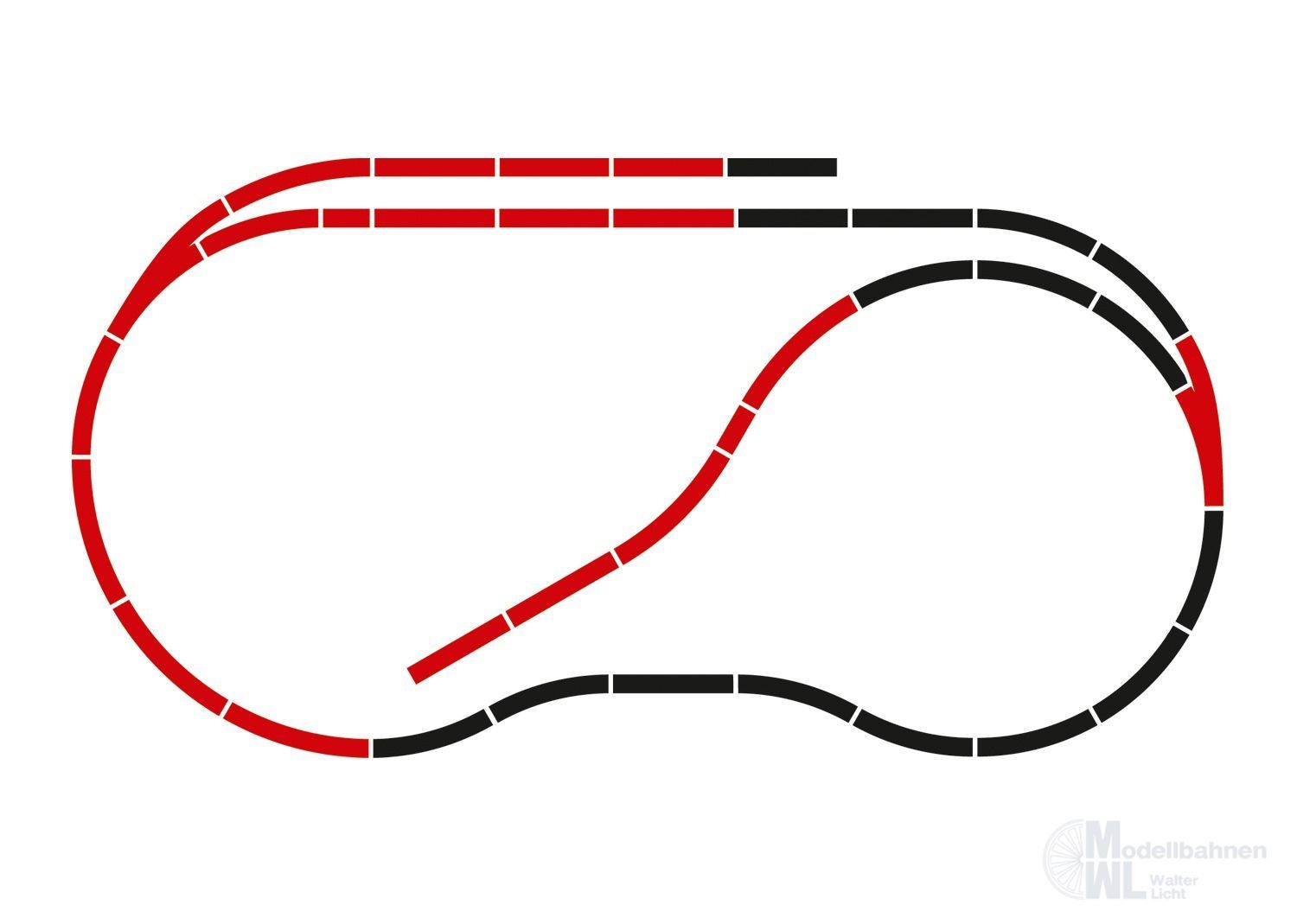 4 gerade Gleise 24188, 4 gerade Gleise 24172, 2 gerade Gleise 24077, 2 gebogene Gleise 24130, 6 gebogene Gleise 24230, 1 Bogenweiche 24671, 1 Bogenweiche 24672, Anschlussmaterial und Aufbauanleitung.