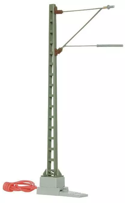 Der Anschlussmast hat eine geteilte Ausführung der oberen Fahrdrahtaufnahme, wodurch die Fahrstrecken unterschiedlichen Stromquellen zugeteilt werden können. Dadurch lassen sich einzelne Abschnitte stromlos schalten, so dass ein Blockbetrieb realisiert werden kann. Mit Ausleger und Anschlusskabel, filigrane Metallausführung. Mittlere Auslage: 3,4 cm. Höhe: 9,9 cm.