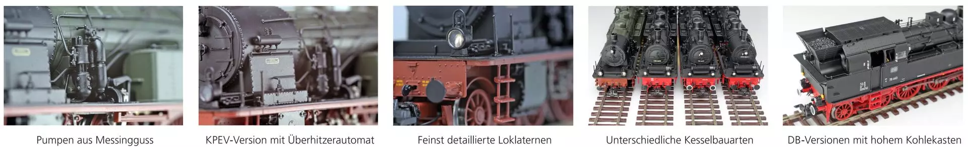Dass unsere T18 schön aussieht und je nach Epoche unterschiedliche Laternen, Speisepumpen, Leitungsführung, Führerhausdächer und Kohlekästen aufweist, erkennen Sie sicher auf den Fotos. Was man vielleicht nicht auf Anhieb auf den Bildern erkennt, ist mit dem Zylinderdampf eine für ESU-Dampfloks neue Funktion. Dieser entstand beim Vorbild, wenn Kondensat ausgeblasen wurde. Da auch beim Original nicht in jeder Fahrsituation Zylinderdampf ausströmt, verhält sichauch unser H0-Modell entsprechend. Natürlich können Sie diese Funktion wie Sie es von ESU gewohnt sind, ganz nach Ihren Wünschen einstellen. Der im Foto sichtbare Rauch musste übrigens nicht durch ein Bildbearbeitungsprogramm verstärkt werden. Auch wenn einige Maschinen bei der DB mit einer Wendezugsteuerung ausgestattet wurden, befand sich die überwiegende Zahl der Loks stets vor dem Zug, was am Zielbahnhof ein Umsetzen der Lok nötig machte. Darum liefern wir unsere Modelle auch mit digital fernsteuerbaren Kupplungen aus. Diese arbeiten mit der ESU-Universalkupplung 41000, aber auch mit der Märklin®-Kurzkupplung, sowie handelsüblichen Bügelkupplungen zusammen. Wie Sie es von anderen ESU-Triebfahrzeugen kennen, lassen sich viele vorbildgerechte Lichtfunktionen schalten. So rangiert man typischer Weise mit nur einer einzigen Stirnlampe an beiden Enden. Bei Dunkelheit unterstützen die Fahrwerk - und die Führerhausbeleuchtung das H0-Personal bei der Arbeit. Tief im Inneren des Metall-Rahmens arbeitet der kräftige Glockenankermotor mit Schwungmasse und sorgt, gebändigt durch den LokSound-5-Decoder, für geschmeidige Fahreigenschaften und eine vorbildgerechte Zugkraft. Durch Abziehen beziehungsweise Aufstecken des Schleifers und drücken eines Schalters im Lokboden wechseln Sie zwischen Zwei- und Mittelleiter-Betrieb.