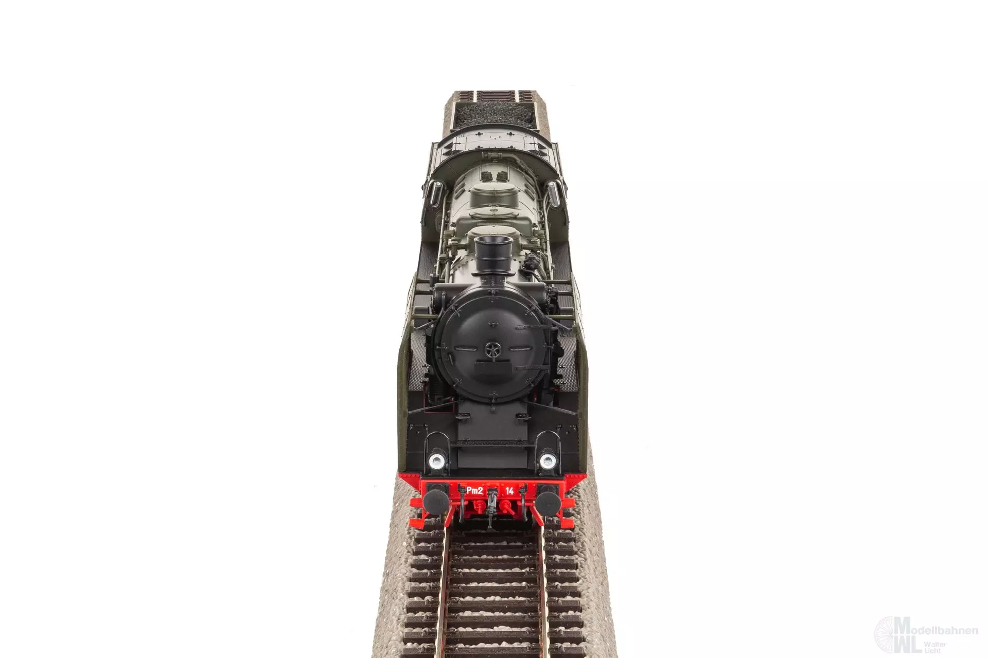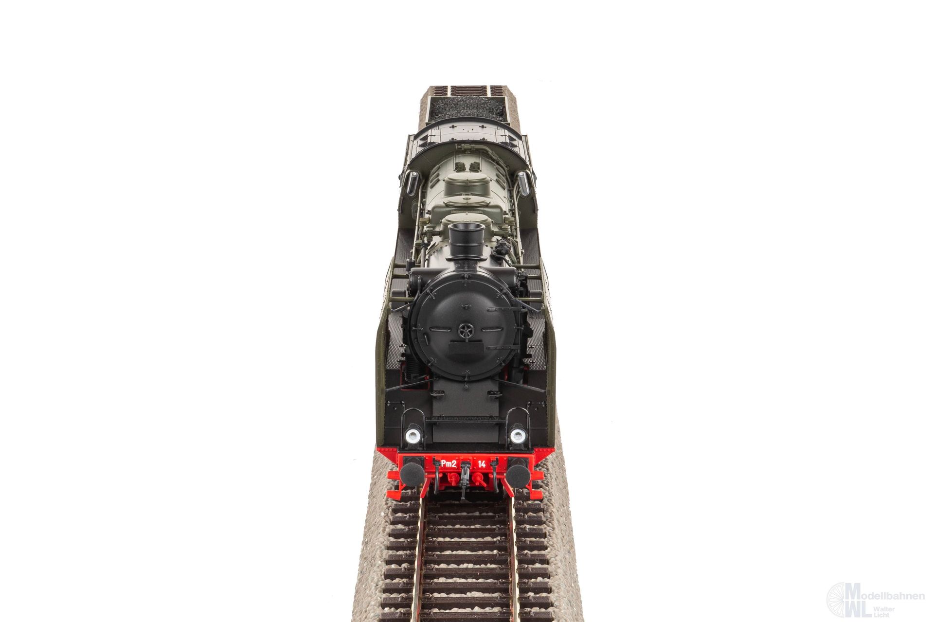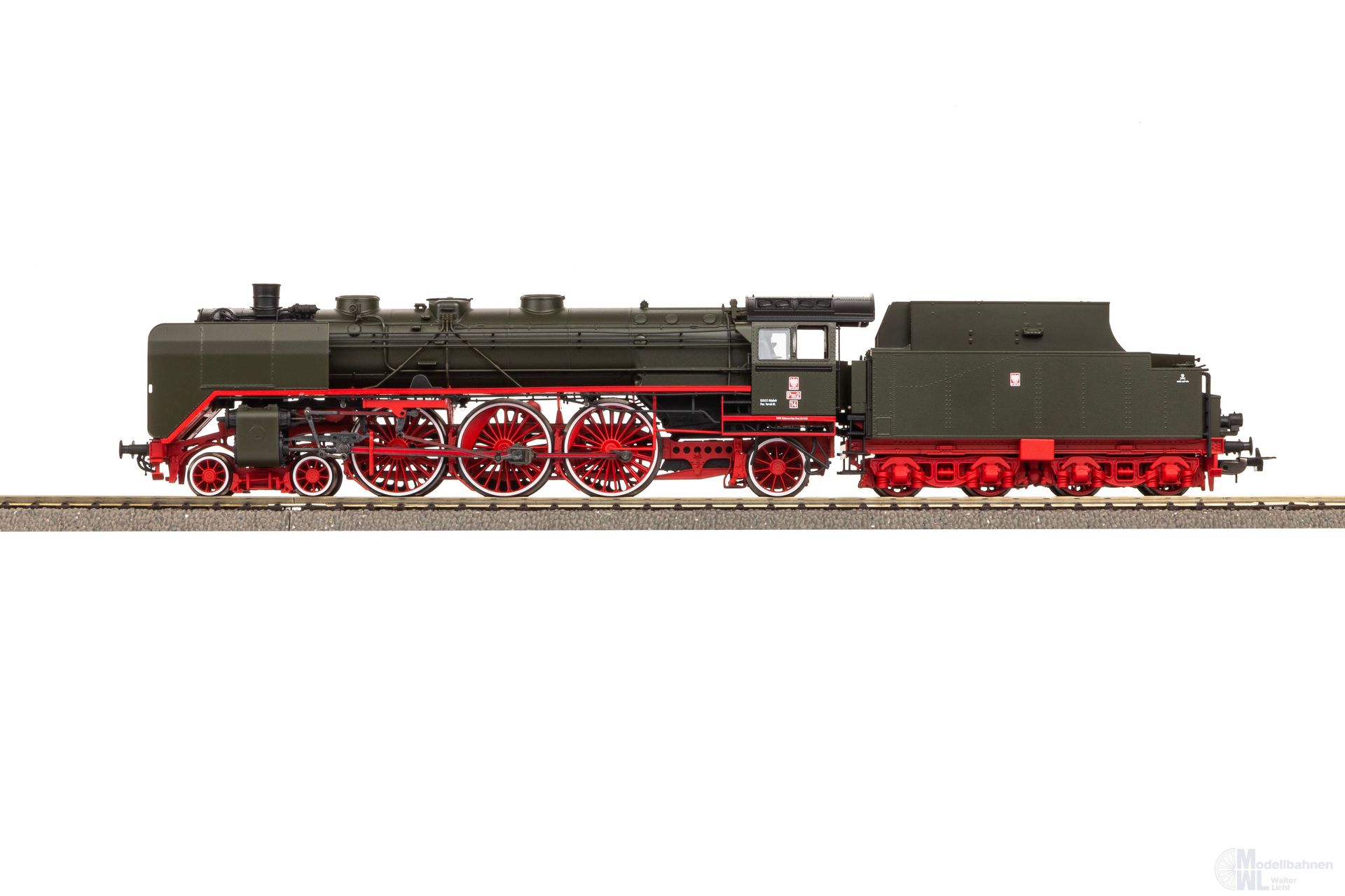 Neuheit 2024: Dampflokomotive Pm2 in authentischer Ausführung der PKP in Epoche III. Der hochliegende schlanke Kessel und der luftige Barrenrahmen mit freiem Durchblick prägen auch im Modell die Silhouette der Maschine. Besonders anmutig wirkt das filigrane Fahrwerk mit feinen Speichen und sehr plastischen Ausgleichsgewichten. Das Modell verfügt über passende Anbauteile wie etwa Glocken, Pumpen und Lampen. Zahlreiche angesetzte Kesselleitungen vervollständigen den äußeren Eindruck. Für ideale Fahreigenschaften sorgt der im Tender untergebrachte Antrieb samt Schwungmasse. Das Modell verfügt ab Werk über einen passenden PSD XP SoundDecoder sowie digital schaltbare Beleuchtungen im Bereich des Fahrwerks und des Führerstandes. Zudem ist im Bereich der Feuerbüchse eine rot flackernde LED digital schaltbar.