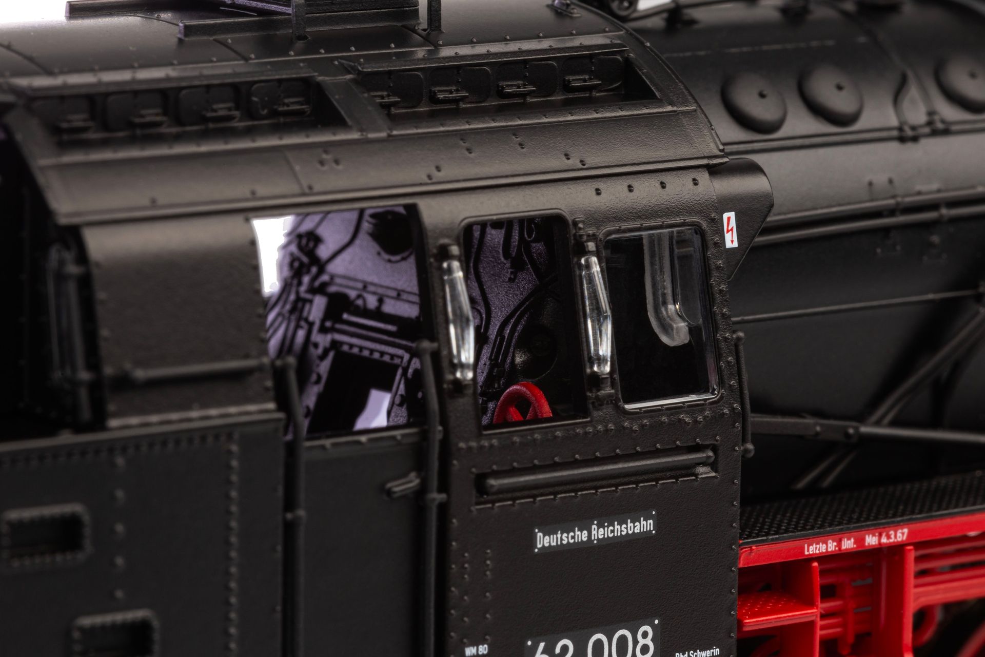 Kessel und Führerhausrückwand frei. Die Zinkdruckguss und Metallteile verleihen dem Modell ein sehr hohes Eigengewicht, welches in Kombination mit dem fein abgestimmten Motor mit Schwungmassen für optimale Fahreigenschaften sorgt. Durch die Nachrüstung eines PSD XP Decoders können die Beleuchtungen des Triebwerkes und des Führerstandes sowie das Flackern in der Feuerbüchse digital geschaltet werden. Hierfür steht eine moderne PluX22Schnittstelle zur Verfügung. Darüber hinaus ist das Modell für eine Soundnachrüstung mit größtmöglichem Lautsprecher vorbereitet. Bahnverwaltung: DR Epoche: III Länge über Puffer: 197 mm Mindestradius: 422 mm Digital Schnittstelle: NEM 658 PluX22 Haftreifen: 2 Kupplung: NEM Schacht Lichtwechsel: Fahrtrichtungsabhängiger Lichtwechsel weiß / rot Digital schaltbare Führerstandsbeleuchtung und Feuerbüchsenbeleuchtung (mit PluX22 Decoder) Dampffunktion nachrüstbar #56163