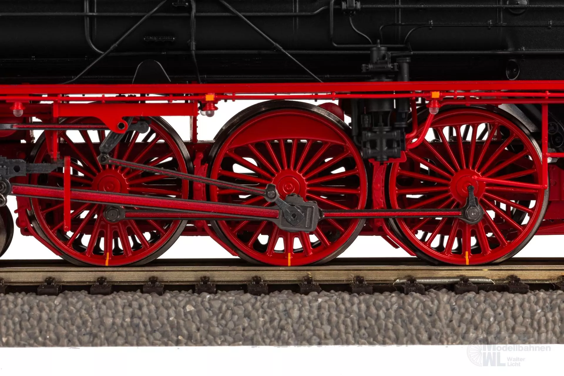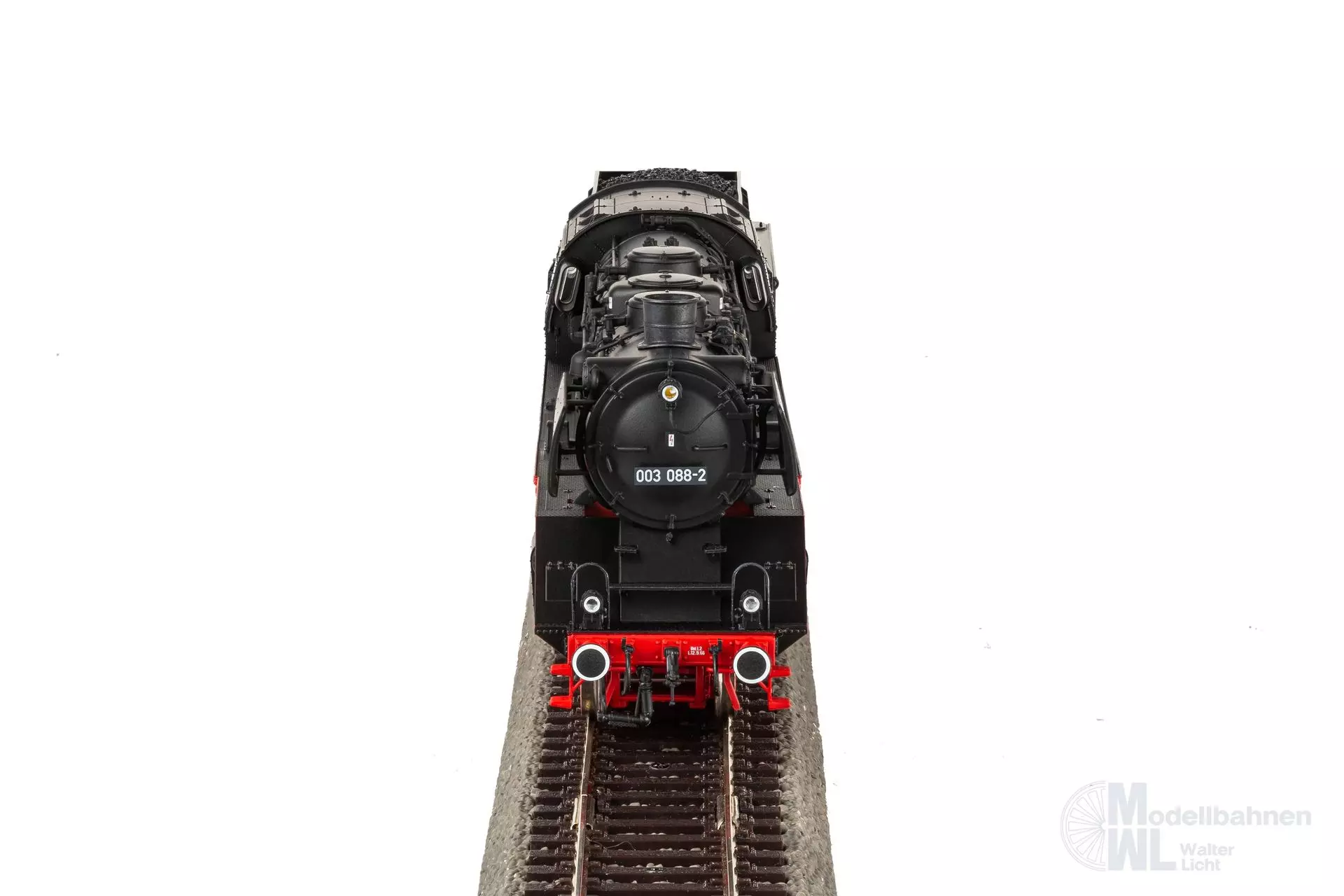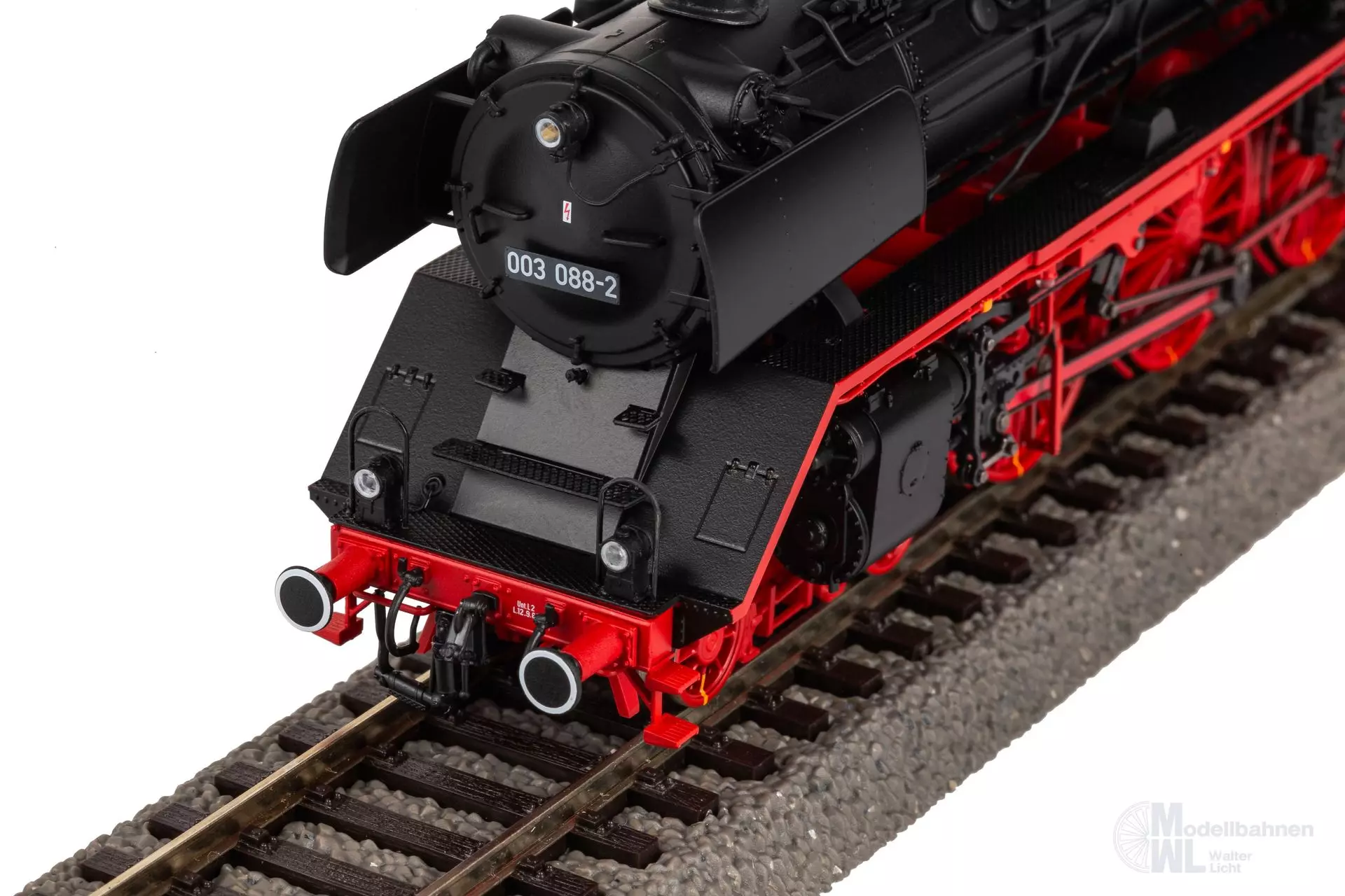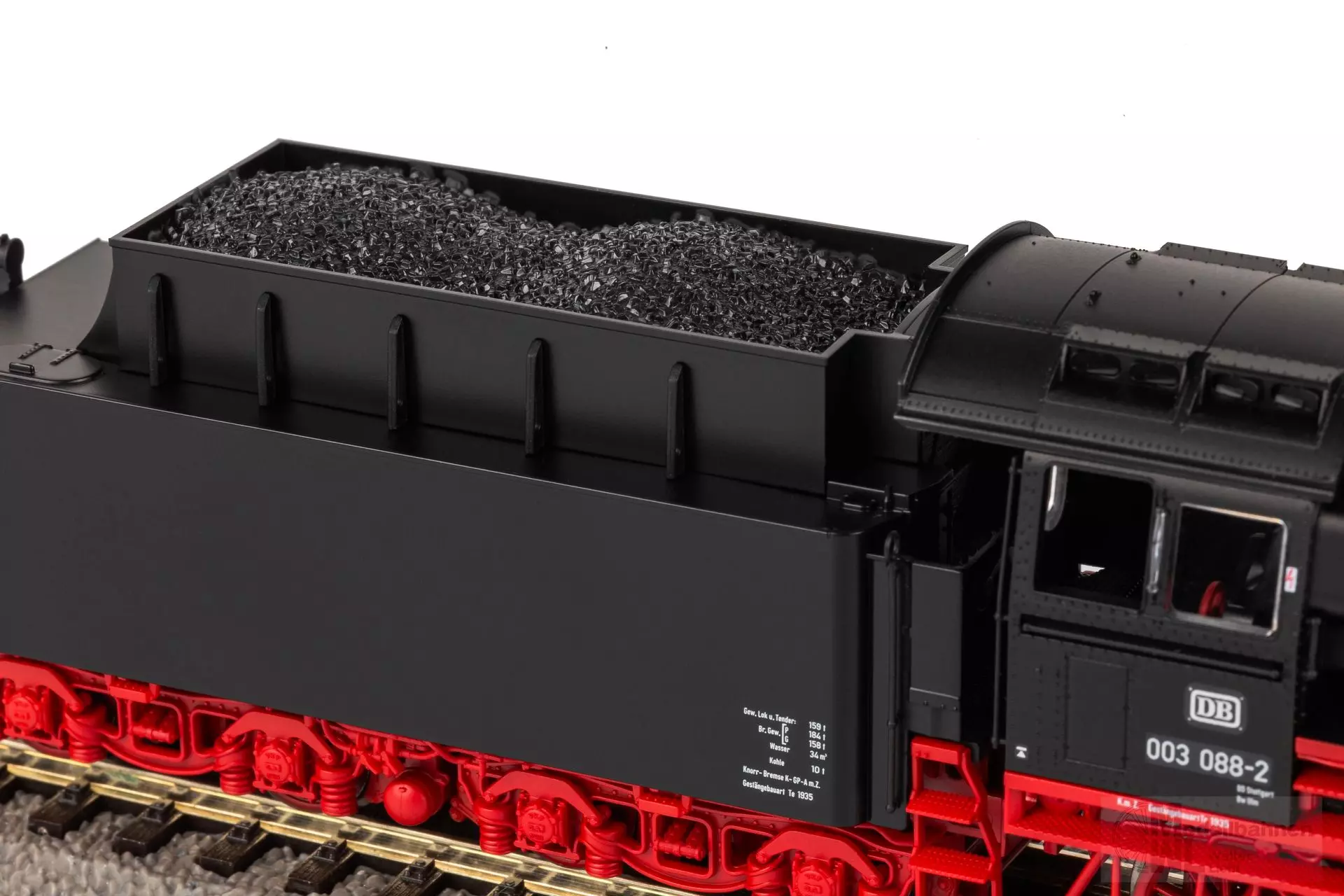 Neuheit 2023: Der hochliegende schlanke Kessel und der luftige Barrenrahmen mit freiem Durchblick prägen das Modell der Baureihe 003. Besonders anmutig wirkt das filigrane Fahrwerk mit feinen Speichen und sehr plastischen AusStromsystem: Gleichsgewichten. Die Neukonstruktion verfügt über passende Anbauteile wie etwa Glocken, Pumpen und Lampen. Zahlreiche angesetzte Kesselleitungen vervollständigen den äußeren Eindruck. Für ideale Fahreigenschaften sorgt der im Tender untergebrachte Antrieb samt Schwungmasse. Die XP Variante des Modells verfügt über eine schaltbare Beleuchtung im Triebwerk und auf dem Führerstand, sowie eine rot flackernde Feuerbüchse und einen gepulsten Verdampfer, der radsynchron angesteuert wird.