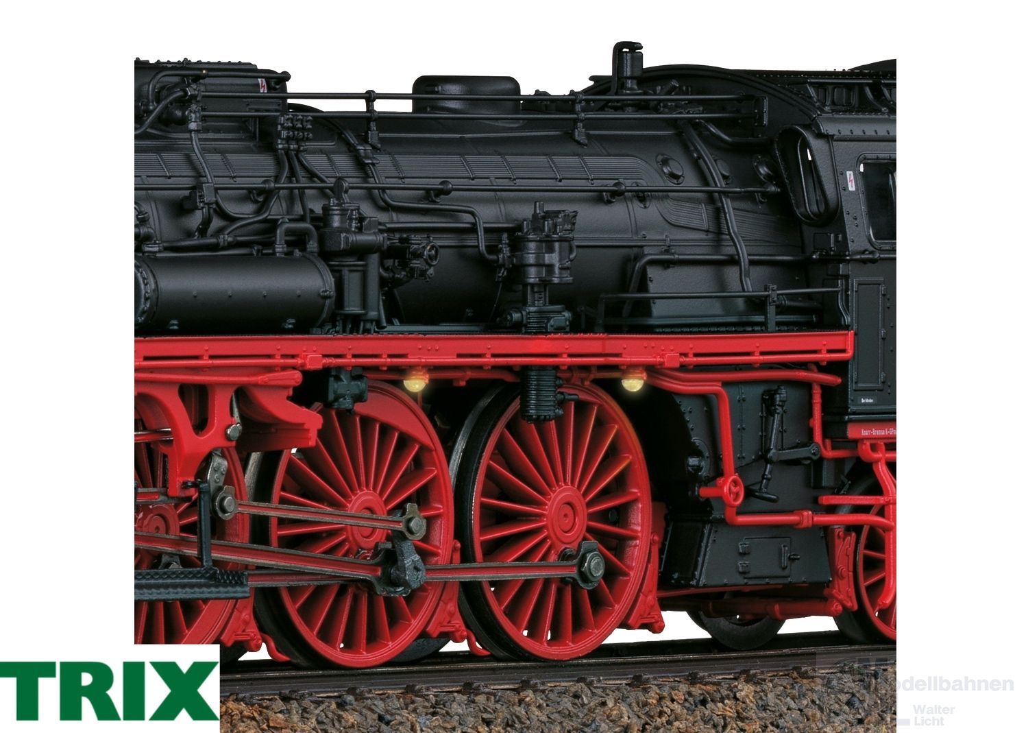 Modell: Mit Digital-Decoder und umfangreichen Geräuschfunktionen. Geregelter Hochleistungsantrieb mit Schwungmasse im Kessel. 3 Achsen angetrieben. Haftreifen. Lokomotive und Tender weitgehend aus Metall. Serienmäßig eingebauter Raucheinsatz, mit geschwindigkeitsabhängigem, dynamischem Rauchausstoß, digital schaltbar. Fahrtrichtungsabhängig wechselndes Dreilicht-Spitzensignal konventionell in Betrieb, digital schaltbar. Führerstandbeleuchtung, Fahrwerkbeleuchtung und Feuerbüchsenflackern sind ebenfalls separat digital schaltbar. Beleuchtung mit wartungsfreien warmweißen und roten Leuchtdioden (LED). Verstellbare Kurzkupplung mit Kinematik zwischen Lok und Tender. Am Tender kinematikgeführte Kurzkupplung mit NEM-Schacht. Pufferhöhe an Lok und Tender nach NEM. Befahrbarer Mindestradius 360 mm. Für große Radien oder Vitrine liegen enger anliegende Aufstiegstreppen unterhalb des Führerhauses zum Austausch bei. Kolbenstangenschutzrohre, Heiz- und Bremsschläuche liegen ebenfalls bei. Länge über Puffer 27,2 cm.