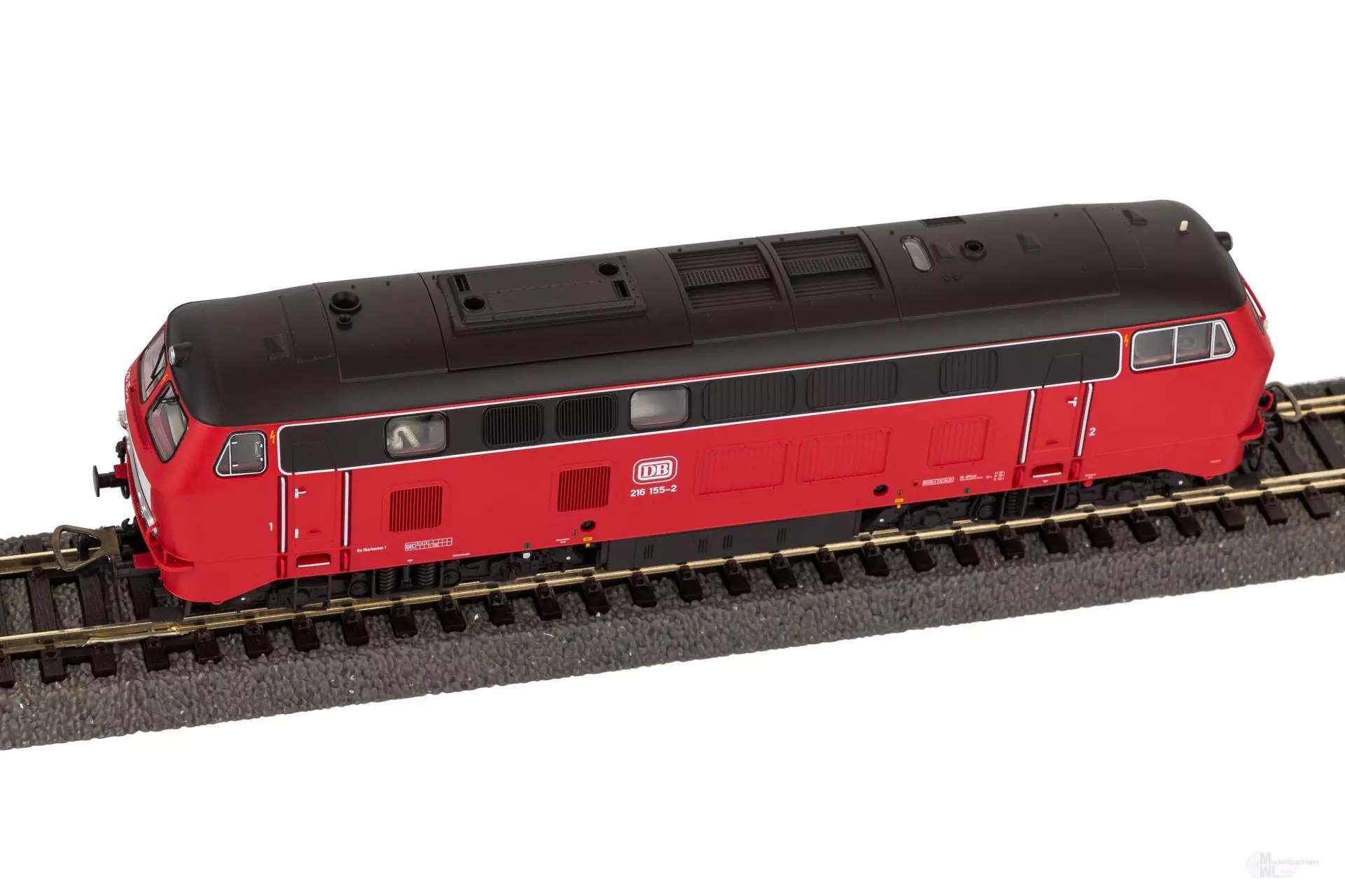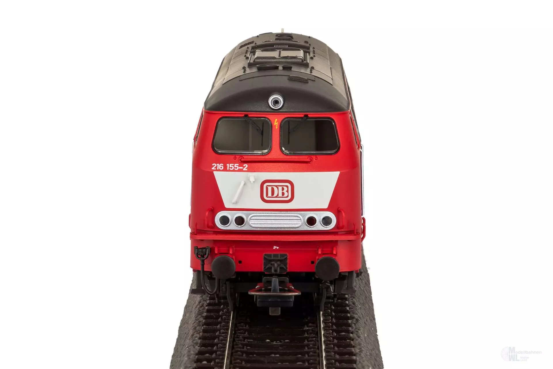 Neuheit 2023: Variante der BR 216 der DB AG mit verkehrsroter Lackierung mit Latz in Epoche IV. Die Baureihe V 160 bzw. 216 war in den 1960er- und 1970er-Jahren bei der Bundesbahn die Eilzuglok für Strecken ohne Fahrdraht. Das Entwicklerteam hat die markante Formgebung des Vorbilds in herausragender Qualität im Modell umgesetzt und dabei Stromsystem: Gleichzeitig ideale Fahreigenschaften erzielt. Diese Attribute werden durch den wirkungsvollen Einsatz perfekter Gravuren und einer bis ins kleinste Detail stimmigen Lackierung unterstrichen. Zeitgemäße LED-Technik dient als Basis für den LichtStromsystem: Wechsel in Rot/Weiß sowie die durch Nachrüstung eines Digitaldecoders schaltbaren Lichtfunktionen. Auf aktuellstem Stand der Technik ist die Digitalschnittstelle PluX22 nach NEM 658, ein Decoder kann ganz einfach aufgesteckt werden. Mit beigelegten Zurüstteilen lässt sich die Pufferbohle des Fahrzeugs vorbildgerecht vervollständigen.